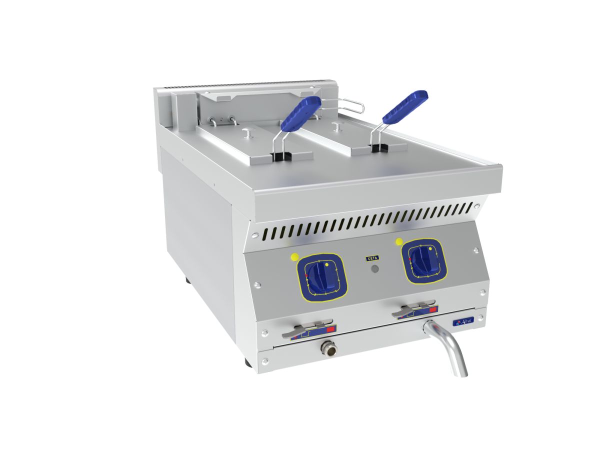 Все регуляторы и функциональные элементы расположены на передней панели. Оснащены двумя термостатами: регулятор температуры и аварийный, который блокирует включение нагревательных элементов при достижении температуры +190 °C. Фритюрницы легки в эксплуатации и санитарно-гигиенической очистке.
