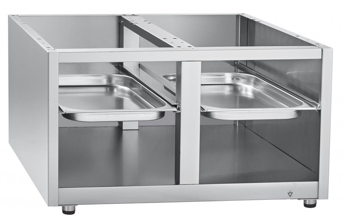 Открытая с лицевой стороны нижняя полка. Направляющие для двух гастроемкостей размером GN 1/1. Регулируемые по высоте ножки.