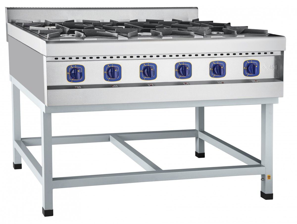 Газовая плита шестигорелочная на подставке ПГК-69П.Предназначена для приготовления первых, вторых и третьих блюд в наплитной посуде. Плита имеет четыре горелки по 5,5 кВт и две мощные горелки "двойная корона" по 7,5 кВт. Плита снабжена устройством "газ-контроль". Внизу - открытая разборная поставка. Плита имеет регулируемые по высоте ножки. В комплекте поставляются дополнительные съемные форсунки под "сжиженный газ".