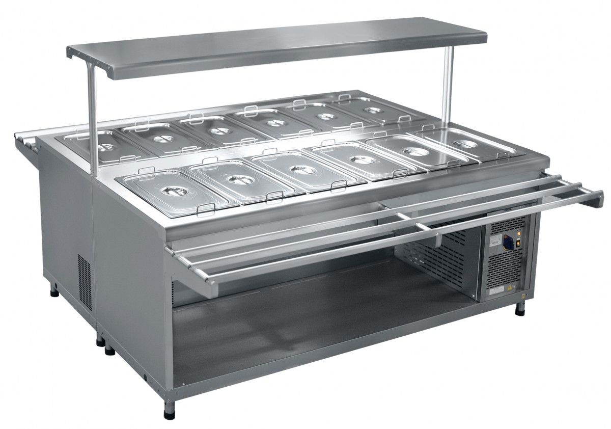Охлаждаемый салат-бар на 12 гастроемкостей GN 1/1 ПВВ(Н)-140СМ-02. Одна полка с лампой посветки. Охлаждаемая столешница. 12 гастроемкостей типоразмера GN 1/1 установлены в столешнице в 2 ряда (по шесть гастроемкостей). Изготовлен из нержавеющей стали AISI 304.