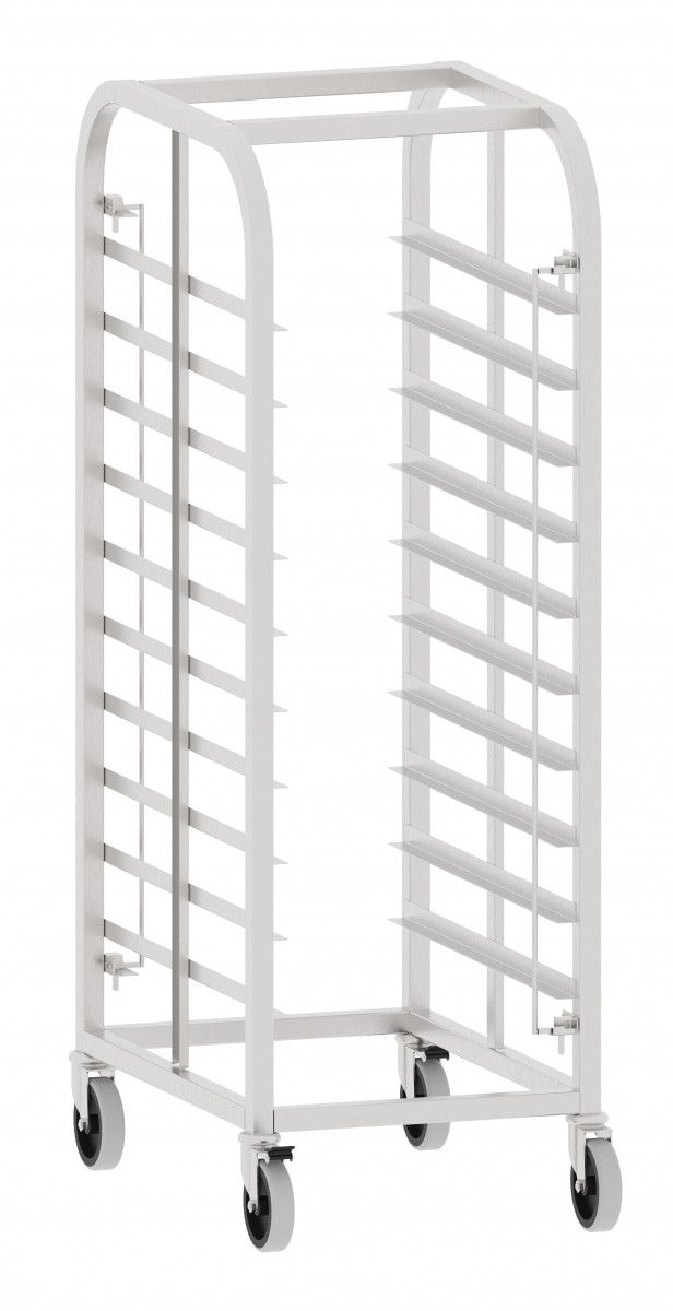 - 10 уровней для установки GN 1/1 - расстояние между уровнями 82 мм - грузоподъемность 100 кг - оснащена 4-мя обрезиненными поворотными колесами d 100 мм, два из которых снабжены тормозными устройствами - в конструкции тележки предусмотрены фиксаторы, которые исключают возможность выпадения гастроемкостей при транспортировке - сварной каркас - все кромки обработаны для безопасной работы персонала при эксплуатации и санитарной обработке