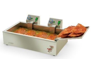 930х505х270 мм, 7,8 кВт, 220 В, +50...+190°С, на 4 чебурека, объем ванны 25 л, объем фритюра 14 л НАЗНАЧЕНИЕ код: 282134 Чебуречница предназначена для приготовления чебуреков, пирожков, беляшей в разогретом масле (фритюре). ТЕХНИЧЕСКИЕ ХАРАКТЕРИСТИКИ Габаритные размеры (длина×ширина×высота), мм: 930х505х270 Номинальная мощность, кВт: 2х3,9 Номинальное напряжение, В: 220 Пределы регулирования температуры, °С: +50…+190 Производительность, шт./час: 36…40 Объем заливаемого масла (фритюра), л: 14 Время приготовления чебурека, мин.: 6…7 Одновременное приготовление чебуреков в ванне, шт.: 4 Время разогрева фритюра до температуры +190°С, мин.: 25 Масса, кг: 12,67 ПРЕИМУЩЕСТВА Специальная решетка в ванне препятствует пригоранию продукта на ТЭНе Специальный поддон для выкладки готового продукта с отверстием для стекания масла обратно в ванну Аппарат оснащен краном для слива масла Блок управления легко снимается с ванны, что обеспечивает простоту санитарно-гигиенической очистки изделия ТЕХНИЧЕСКОЕ ОПИСАНИЕ Чебуречница выполнена из пищевой нержавеющей стали. Она состоит из фритюрной ванны и блока управления ТЭНом. Ванна имеет маркировку уровня масла (max и min) и кран для слива масла. Блок управления включает в себя ТЭН и терморегулятор. ТЭН, изготовленный из пищевой нержавеющей стали, обеспечивает нагрев масла. Форма и электромощность ТЭНа оптимальны с точки зрения нагрева фритюра и сохранения его качественных характеристик в течение рабочей смены. Терморегулятор предназначен для поддержания в ванне заданной температуры масла +50°С…+190°С. Специальная нержавеющая решетка, закрывающая ТЭН, исключает контакт чебуреков и ТЭНа, тем самым предотвращая подгорание продукта. После обжарки готовые чебуреки выкладывают на специальный поддон, установленный на борту ванны. Отверстия в поддоне позволяют излишкам масла стекать обратно в ванну, что обеспечивает существенное снижение расхода масла. В комплекте поставляется кулинарный пинцет для переворачивания и выкладки чебуреков. ХАРАКТЕРИСТИКИ УПАКОВКИ Количество упаковок, шт.: 1 Габариты в упаковке (ДхШхВ), мм: 630х505х270 Масса в упаковке, кг: 13,7 Тип упаковки: гофрокартонная коробка КОДЫ ИЗДЕЛИЙ ТНВД: 8419818000 ОКПД2: 28.93.15.124 под заказ