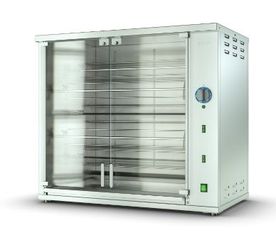 945х560х825 мм, 7,3 кВт, 220 В, +50...+250°С, шампурный, 5 вертелов (2 спереди, 3 сзади), на 25 кур НАЗНАЧЕНИЕ код: 294262 Гриль для кур «Командор»-2/5-Э предназначен для обжаривания целых тушек кур на вертелах (шампурах). ТЕХНИЧЕСКИЕ ХАРАКТЕРИСТИКИ Габаритные размеры (длина×ширина×высота), мм: 945х560х825 Номинальная мощность, кВт: 7,3 Номинальное напряжение, В: 220 Пределы регулирования температуры, °С: +50...+250 Максимальное количество одновременно загружаемых тушек (1 кг/1,7 кг), шт.: 25/20 Количество шампуров, шт.: 5 Время приготовления при полной загрузке камеры, мин.: 80…100 Масса, кг: 52,8 ПРЕИМУЩЕСТВА Два ряда шампуров: дальний - для жарки кур, ближний - для поддержания готовых кур в горячем состоянии Постоянная скорость вращения шампура и оптимальное расстояние от тушки до ТЭНов обеспечивают равномерную прожарку кур и высокую производительность гриля Специальный узел вращения и поддержки шампура обеспечивает быструю установку и выемку шампуров из гриля Шампур имеет три спицы и оснащен торцевыми фиксаторами кур, исключающими проворачивание кур во время приготовления Стеклянные дверцы имеют магнитный фиксатор закрытого положения В положении открытых дверей шампуры с курами легко вынимаются из гриля ТЕХНИЧЕСКОЕ ОПИСАНИЕ Корпус гриля изготовлен из пищевой нержавеющей стали AISI430. Приготовление тушек осуществляется благодаря инфракрасному излучению трех пар ТЭНов. ТЭНы расположены на задней стенке гриля в непосредственной близости от вращающихся шампуров с курами. Они имеют специальные отражатели, которые повышают эффективность и равномерность нагрева продукта. Интенсивность нагрева верхней пары ТЭНов регулируется терморегулятором, ручка которого расположена на передней панели гриля. Средняя и нижняя пары ТЭНов включаются соответствующими выключателями. По мере вращения шампуров происходит равномерная тепловая обработка продукта со всех сторон. Гриль имеет пять съемных шампуров. Три шампура, расположенные возле ТЭНов, предназначены для жарки кур. Два шампура, удаленные от ТЭНов, служат для поддержания готовых кур в горячем состоянии. Одновременное вращение пяти шампуров осуществляется электродвигателем. Все внутренние элементы, контактирующие с продуктами, выполнены из пищевой нержавеющей стали. В основании гриля расположен поддон для сбора жира. Дверцы гриля выполнены из термостойкого стекла и позволяют наблюдать за процессом приготовления. ХАРАКТЕРИСТИКИ УПАКОВКИ Количество упаковок, шт.: 1 Габариты в упаковке (ДхШхВ), мм: 1000х520х1000 Масса в упаковке, кг: 60,8 Тип упаковки: на деревянном поддоне в стрейч-пленке КОДЫ ИЗДЕЛИЙ ТНВД: 8419818000 ОКПД2: 27.51.28.150 под заказ