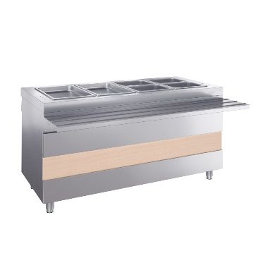 1500 х 700 (1015*) х 880 ± 20 мм, 0,4 кВт, 220 В, ванна гастронормированна (4 х GN-1/1-150мм), без полок, на столешнице отверстия для установки полок *с направляющей НАЗНАЧЕНИЕ код: 312666 Охлаждаемый стол предназначен для кратковременного хранения и раздачи холодных напитков, салатов, кисломолочных продуктов и других блюд, требующих хранения в охлажденном состоянии. Блюда и продукты могут размещаться в охлаждаемой ванне стола в посуде, в фабричной упаковке или в гастроемкостях. ТЕХНИЧЕСКИЕ ХАРАКТЕРИСТИКИ Габаритные размеры (Д х Ш х В), мм: 1500 х 1015 х 880 ± 20 Номинальная мощность подключаемого оборудования, кВт: 0,4 Номинальное напряжение, В: 220 Температура в гастроемкостях, °C: -2…+10 Хладагент: R404А Масса, кг: 103,0 ПРЕИМУЩЕСТВА Предназначен для размещения гастроемкостей глубиной до 150 мм Подходит для хранения продуктов на льду Имеется возможность комплектования 1-но, 2-х или 3-х ярусной полкой для размещения тарелок с блюдами Простая и легкозаменяемая передняя панель модуля, изменяющая дизайн линии, позволяет создать необходимый интерьер в заведении любого типа Беспрепятственное и легкое скольжение подносов по направляющим благодаря специальным выпуклым элементам Регулируемые опорные ножки из нержавеющей стали компенсируют неровности пола Защитные лобовые стекла и козырьки (поставляются отдельно) Возможна модернизация в передвижной модуль при помощи Комплекта колес для электр. модуля Ривьера ТЕХНИЧЕСКОЕ ОПИСАНИЕ Конструкция сборная, бескаркасная. Столешница выполнена из нержавеющей стали AISI430 и усилена листом ламинированной ДСП толщиной 16 мм. В столешницу вмонтирована ванна размером 1310х510х180 мм, выполненная из нержавеющей стали. В ванну могут устанавливаться гастроемкости GN 1/1 максимальной глубиной 150 мм - 4шт. Чтобы установить в ванну гастроемкости GN 1/2, 1/3, в комплект поставки входят съемные перемычки из нержавеющей стали П-образной формы. Температура полезного объема в пределах -2°C …+10°C. Напитки и продукты в фабричной упаковке или тарелках могу размещаться непосредственно на дне ванны. В ванну можно засыпать чешуйчатый лед, на котором можно разместить напитки в стеклянной или пластиковой таре. В этом случае необходимо обеспечить слив растаявшей воды в канализацию. Для отвода воды, образующейся от таяния льда, на дне ванны предусмотрено сливное отверстие. В холодильной системе используется хладагент R404А. Ножки модуля выполнены из нержавеющей стали, имеют пластиковую опорную часть и регулируют высоту модуля в пределах ±20 мм. В комплект модуля входят направляющая для подносов (1500х315 мм) выполненная из нержавеющей стали AISI430. Направляющая представляет собой сплошную поверхность с выпуклыми формовками для облегчения скольжения подносов. Направляющая мармита может соединяться с направляющими соседних модулей, формируя сплошную ровную поверхность. Вдоль всей фасадной части под столешницей расположена сменная декоративная панель 1500х190 мм. Охлаждаемый стол может отдельно комплектоваться 1-но, 2-х или 3-х ярусной полкой. Гастроемкости в комплект поставки не входят и поставляются отдельно. Модуль может дополнительно оснащаться светильником под направляющей. ХАРАКТЕРИСТИКИ УПАКОВКИ Количество упаковок, шт.: 1 Габариты в упаковке (ДхШхВ), мм: 1530х755х1100 Масса в упаковке, кг: 137,0 Тип упаковки: Ящик из ДВП на деревянном поддоне КОДЫ ИЗДЕЛИЙ ТНВД: 8418501900 ОКПД