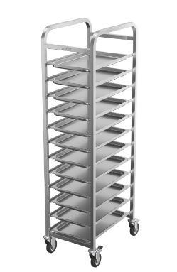 390х560х1575 мм, сварная, AISI304, вместимость GN-1/1 - 12шт, расстояние между уровнями 110 мм, 2 колеса с тормозом НАЗНАЧЕНИЕ код: 318087 Изделие «Шпилька кондитерская» серии «люкс» предназначена для технологического хранения и транспортировки Гастроемкостей 1.1 (размером 325х530) внутри цеха, а также по территории предприятия. ТЕХНИЧЕСКИЕ ХАРАКТЕРИСТИКИ Габаритные размеры (Д х Ш х В), мм: 390х560х1575 Количество уровней: 12 Расстояние между уровнями, мм: 110 Максимальная распределенная нагрузка общая, кг: 160 Максимальная распределенная нагрузка на одну полку, кг: 10 Материал направляющих: нержавеющая сталь AISI 304 Материал стоек: нержавеющая сталь Толщина металла стоек, мм: 1,5 Профиль стоек: квадратная труба Размер профиля стоек, мм: 25х25 Колесная опора без тормоза, шт: 2 Колесная опора с тормозом, шт: 2 Диаметр поворотных колес, мм: 100 Масса, кг: 17,2 ПРЕИМУЩЕСТВА Шпилька выполнена из нержавеющей стали AIS304 Направляющие из листа имеют отгиб на концах, предотвращающий выпадение емкостей при перемещении шпильки Кромки направляющих имеют подгиб (фальцовку) для исключения травматизма персонала Две из четырёх колёсных опор оснащены тормозом ТЕХНИЧЕСКОЕ ОПИСАНИЕ Шпилька для гастроемкостей имеет сварную конструкцию. Рамы шпильки изготовлены из нержавеющей трубы AISI 304 сечением 25х25 мм. Рамы приварены друг к другу посредством перемычек из профильной нержавеющей трубы. К рамам приварены 12 пар направляющих для размещения гастроемкостей GN1/1. Направляющие изготовлены из нержавеющей стали AISI 304. Они имеют концевые отгибы, обеспечивающие фиксацию противней и предотвращающие их выпадение при движении шпильки. Расстояние между направляющими по высоте – 110 мм. Кромки направляющих имеют подгиб (фальцовку) для исключения травматизма персонала. Суммарная грузоподъемность тележки составляет 160 кг. Нагрузка на каждый уровень направляющих не должна превышать 10 кг. Шпилька снабжена четырьмя колесами диаметром 100 мм, два из которых оснащены тормозом. ХАРАКТЕРИСТИКИ УПАКОВКИ Количество упаковок, шт.: 1 Габариты в упаковке (ДхШхВ), мм: 605х440х1605 Масса в упаковке, кг: 26,5 Тип упаковки: Гофрокартонная коробка КОДЫ ИЗДЕЛИЙ ТНВД: 9403208009 ОКПД2: 25.99.12.112 Под заказ