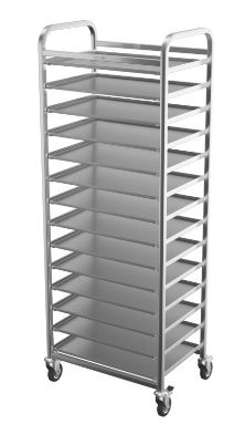 670х450х1790 мм, сварная, AISI304, вместимость противней 600х400мм - 14шт., расстояние между уровнями 110 мм, 2 колеса с тормозом НАЗНАЧЕНИЕ код: 318881 Изделие «Шпилька кондитерская» серии «люкс» предназначена для технологического хранения и транспортировки пекарских поддонов 600х400мм внутри цеха, а также по территории предприятия. ТЕХНИЧЕСКИЕ ХАРАКТЕРИСТИКИ Габаритные размеры (Д х Ш х В), мм: 670х450х1790 Количество уровней: 14 Расстояние между уровнями, мм: 110 Максимальная распределенная нагрузка общая, кг: 160 Максимальная распределенная нагрузка на одну полку, кг: 10 Материал направляющих: нержавеющая сталь AISI 304 Материал стоек: нержавеющая сталь Толщина металла стоек, мм: 1,5 Профиль стоек: квадратная труба Размер профиля стоек, мм: 25х25 Колесная опора без тормоза, шт: 2 Колесная опора с тормозом, шт: 2 Диаметр поворотных колес, мм: 100 Масса, кг: 21 ПРЕИМУЩЕСТВА Шпилька выполнена из нержавеющей стали AIS304 Направляющие из листа имеют отгиб на концах, предотвращающий выпадение емкостей при перемещении шпильки Кромки направляющих имеют подгиб (фальцовку) для исключения травматизма персонала Две из четырёх колёсных опор оснащены тормозом ТЕХНИЧЕСКОЕ ОПИСАНИЕ Шпилька для пекарских листов имеет сварную конструкцию. Рамы шпильки изготовлены из нержавеющей трубы AISI 304 сечением 25х25 мм. Рамы приварены друг к другу посредством перемычек из профильной нержавеющей трубы. К рамам приварены 14 пар направляющих для размещения хранения пекарских листов размером 600х400 мм. Направляющие изготовлены из нержавеющей стали AISI 304. Они имеют концевые отгибы, обеспечивающие фиксацию противней и предотвращение их выпадение при движении шпильки. Расстояние между направляющими по высоте – 110 мм. Кромки направляющих имеют подгиб (фальцовку) для исключения травматизма персонала. Суммарная грузоподъемность тележки составляет 160 кг. Нагрузка на каждый уровень направляющих не должна превышать 10 кг. Тележка снабжена четырьмя колесами диаметром 100 мм, два из которых оснащены тормозом. ХАРАКТЕРИСТИКИ УПАКОВКИ Количество упаковок, шт.: 1 Габариты в упаковке (ДхШхВ), мм: 720х500х1 815 Масса в упаковке, кг: 30,4 Тип упаковки: Гофрокартонная коробка КОДЫ ИЗДЕЛИЙ ТНВД: ОКПД2: 25.99.12.112 Под заказ