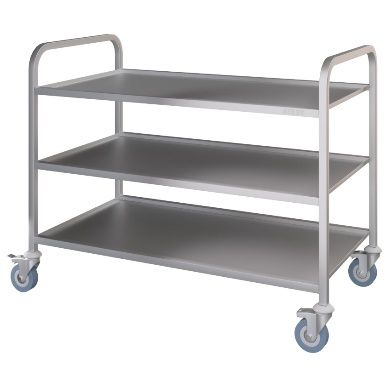 1100х600х850 мм, AISI304, 3 полки, 4 колеса, 2 из них с тормозом, сварная НАЗНАЧЕНИЕ код: 327388 Тележка сервировочная ТС предназначена для перемещения в зал приема пищи готовых блюд, напитков и посуды, а также для подачи грязной посуды из зала - в моечное отделение. ТЕХНИЧЕСКИЕ ХАРАКТЕРИСТИКИ Габаритные размеры (Д х Ш х В), мм: 1100х600х850 Количество уровней: 3 Высота бортика полки мм: 20 Расстояние между уровнями, мм: 237 Максимальная распределенная нагрузка общая, кг: 150 Максимальная распределенная нагрузка на одну полку, кг: 50 Материал полки: нержавеющая сталь AISI304 Толщина металла полок, мм: 0,8 Материал стоек: нержавеющая сталь AISI 304 Профиль стоек: квадратная труба Сечение профиля стоек , мм: 25х25 Колесная опора без тормоза, шт: 2 Колесная опора с тормозом, шт: 2 Диаметр поворотных колес, мм: 75 Масса, кг: 20,5 ПРЕИМУЩЕСТВА Полки по периметру имеют герметичный бортик высотой 20 мм Тележка выполнена из нержавеющей стали AISI304 Две из четырёх колёсных опор оснащены тормозом Кромки направляющих имеют подгиб (фальцовку) для исключения травматизма персонала ТЕХНИЧЕСКОЕ ОПИСАНИЕ Тележка сервировочная ТС имеет сварную конструкцию. Рамы тележки изготовлены из нержавеющей трубы AISI 304 сечением 25х25 мм. К рамам приварены полки, изготовленные из нержавеющей стали AISI 304. Полки по периметру имеют герметичный бортик высотой 20 мм. Высота просвета между полками 237 мм. Суммарная грузоподъемность тележки составляет 150 кг. Нагрузка на каждую полку не должна превышать 50 кг. Тележка снабжена четырьмя колесами диаметром 75 мм, два из которых оснащено тормозом. ХАРАКТЕРИСТИКИ УПАКОВКИ Количество упаковок, шт.: 1 Габариты в упаковке (ДхШхВ), мм: 1150х650х800 Масса в упаковке, кг: 24 Тип упаковки: Гофрокартонная коробка КОДЫ ИЗДЕЛИЙ ТНВД: 9403208009 ОКПД2: 25.99.12.112