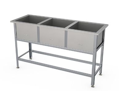 2000х700х870 мм, 3 секции 600х600х450 мм, ванна-AISI430, каркас-оц.сталь НАЗНАЧЕНИЕ код: 309257 Ванны моечные предназначены для использования в моечном отделении на предприятиях общественного питания, для мытья, дезинфекции и ополаскивания использованной посуды и инвентаря. ТЕХНИЧЕСКИЕ ХАРАКТЕРИСТИКИ Габаритные размеры (Д х Ш х В), мм: 2000х700х870 Внутренние размеры ванны, мм: 600х600х450 Ширина бортов по периметру ванны, мм: 50 Диаметр сливного отверстия, мм: 48 Отверстие под смеситель: нет Материал ванны: нерж. сталь AISI430 Толщина металла ванны, мм: 0,8 Материал каркаса: оцинкованная сталь Толщина металла каркаса, мм: 1,2 Профиль ножек: уголок Размер профиля ножек, мм: 40х40 Диапазон регулировки опорных ножек, мм: ±20 Масса, кг: 46,9 ПРЕИМУЩЕСТВА Ванна изготовлена из нержавеющей стали AISI430, что значительно упрощает санитарно-гигиеническую обработку Все кромки ванны и элементов каркаса имеют подгиб (фальцовку), что полностью исключает получение травмы персоналом при сборке, эксплуатации и санитарной обработке ванны Углы ванн заварены и зашлифованы, что обеспечивает гигиеническую безопасность и облегчает санитарную обработку ванн Опорные ножки имеют пластиковое основание, которое не повреждает напольное покрытие при эксплуатации ванны Ножки ванны имеют регулируемые по высоте опоры, позволяющие компенсировать неровности пола ТЕХНИЧЕСКОЕ ОПИСАНИЕ Ванна моечная трёхсекционная, сварная выполнена из нержавеющей стали марки AISI430. Углы ванн заварены и зашлифованы. Борт по периметру ванны составляет 50мм. Каркас разборный выполнен из оцинкованной стали. Стойки каркаса представляют собой уголок с фальцованными краями для увеличения жесткости конструкции. Под ванной установлены два уголка из оцинкованной стали. Снизу каркас усилен четырьмя перемычками. Все кромки ванны и элементов каркаса имеют подгиб (фальцовку), что полностью исключает получение травмы персоналом при сборке, эксплуатации и санитарной обработке ванны. Опорные ножки регулируются по высоте и изготовлены из нержавеющей стали c пластиковой подложкой внизу для предотвращения повреждения напольного покрытия. В комплект поставки ванны не входит система разрыва струи. ХАРАКТЕРИСТИКИ УПАКОВКИ Количество упаковок, шт.: 2 Габариты в упаковке (ДхШхВ), мм: 2 020х720х470, 1940х100х70 Масса в упаковке, кг: 51,2 Тип упаковки: гофрокартонная коробка КОДЫ ИЗДЕЛИЙ ТНВД: 7324290000 ОКПД2: 25.99.29.190 Под заказ