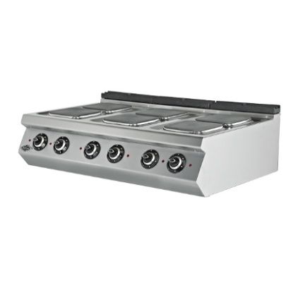 Электрическая плита 6 конфорочная (без подставки) Мощность: 13,5 кВт Электрический входной сигнал 200 в. переменного тока 3Н ЧП Сечение кабеля 5х4 мм 6 положений переключателей Легко чистится и гигиенический. Корпус из нержавеющей стали. Габариты: 1200x730x300 мм Вес: 80 кг