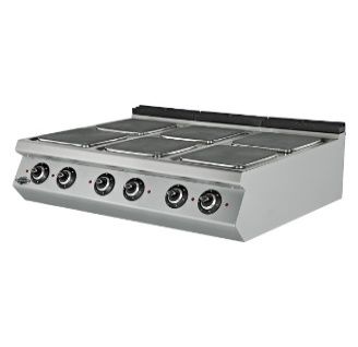 Электрическая плита 6 конфорочная (без подставки) Мощность: 24 кВт Электрический входной сигнал 400 в. переменного тока 3Н ЧП Сечение кабеля 5х6 мм 6 положений переключателей Легко чистится и гигиенический. Корпус из нержавеющей стали. Габариты: 1200x900x300 мм Вес: 121 кг