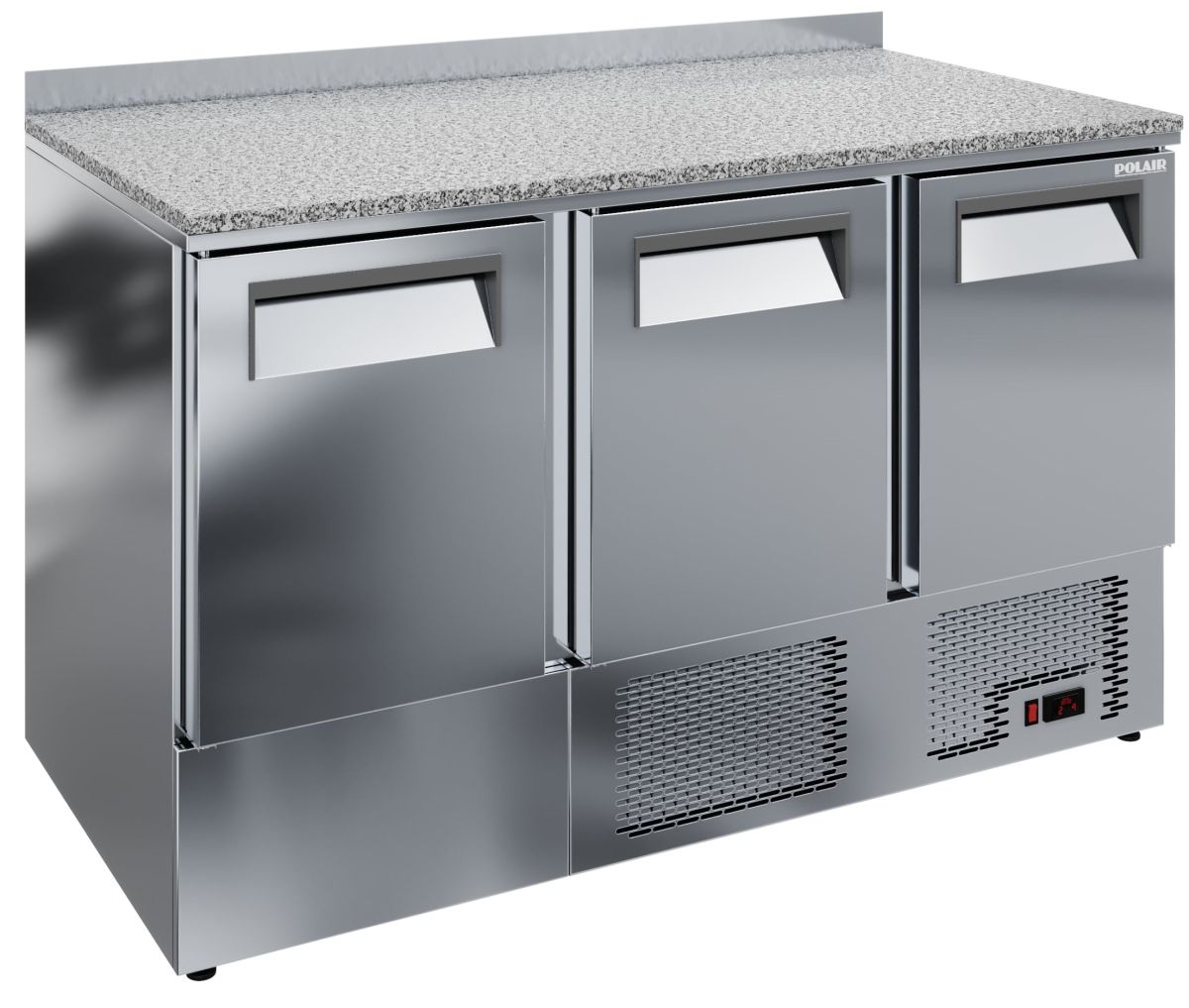 Узкий трехдверный стол с рабочей поверхностью из натурального гранита, материала, идеального для работы с тестом, кондитерскими изделиями, шоколадом, сервировки мороженого дает возможность сохранить свежесть охлажденных продуктов и обесечить удобство работы профессионалов пицерии, пекарни, кондитерского производства и т.п.