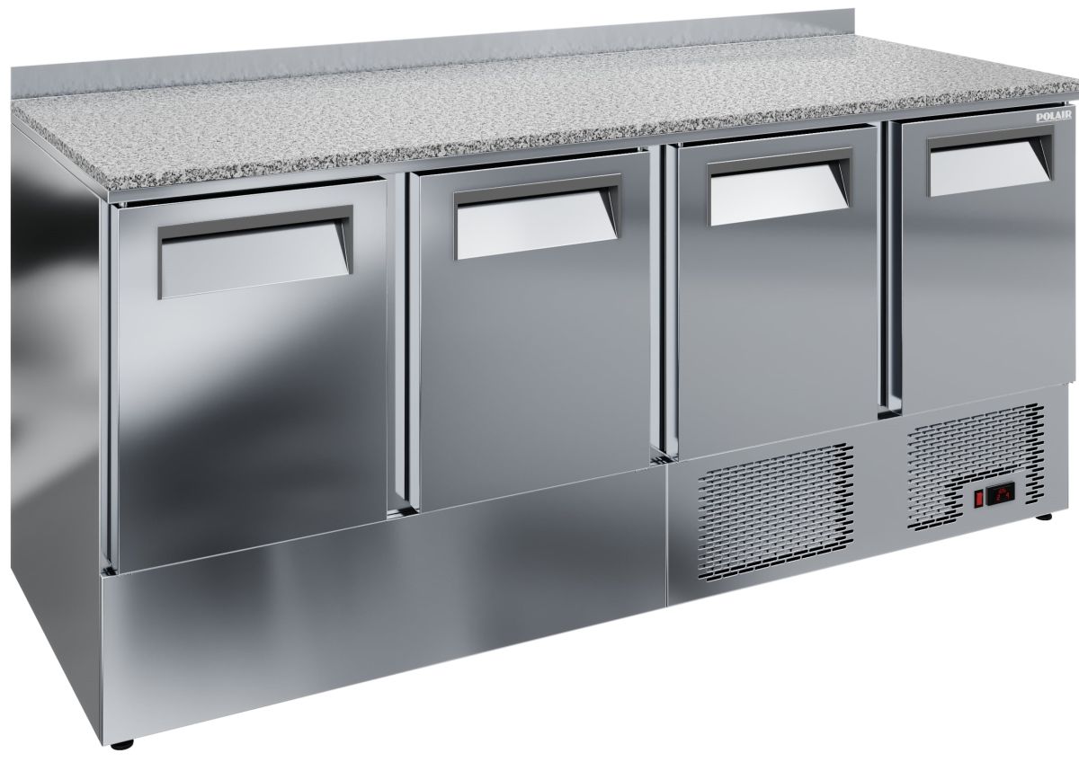 Четырехдверный стол с просторным отеком для хранения охлажденных продуктов и столешницей из натурального гранита с бортом из нержавеющей стали - прекрасное решение для оснащения пекарни, пиццерии, кондитерской и т.п. Поверхность из натурального гранита идеальна для работы с тестом, шоколадом, мороженым, кондитерскими изделиями. Блоки из выдвижных ящиков или распашные двери для каждого из проемов - на выбор за покупателем.