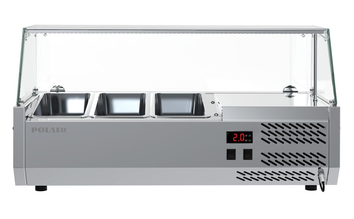 Компактная витрина на 3 гастроемкости GN1/3*, размещенных наклонно - идеальное дополнение для холодильного стола TM1ENpizza. Может быть установлена на гранитные борта стола данной модели или на любую ровную поверхность. Комплектуется стеклянной надстройкой с подсветкой. * гастроемкости в комплект поставки не входят
