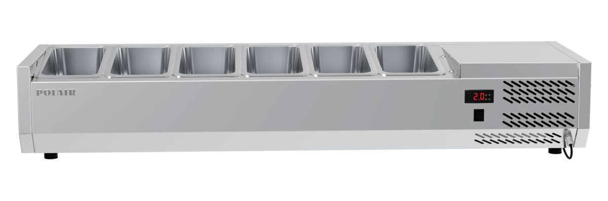 Витрина рассчитана на 6 гастроемокостей GN1/3* глубиной до 150 мм, размещаемых наклонно. Идеальна для дополнения стола TM2ENpizza с установкой на его грантные борта или на любую ровную поверхность. * гастроемкости в комплект поставки не входят