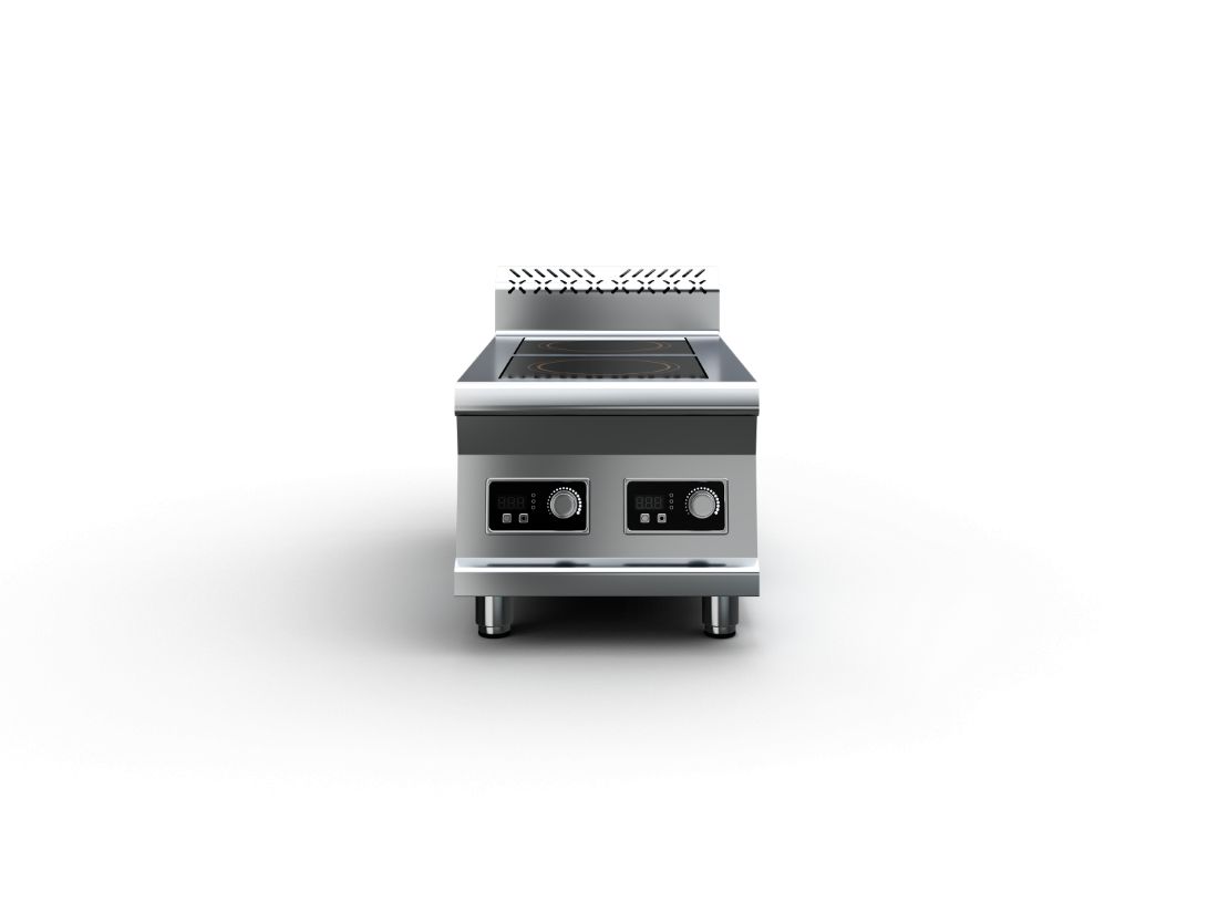 Плита индукционная, столешница из нержавеющей стали марки AISI 430 толщиной 1 мм, корпус из нержавеющей стали марки AISI 430 толщиной 0,8 мм. Имеет 2 конфорки мощностью по 3,5 кВт, питание 380 В. Габариты стеклокерамики 280х280х6 мм. Поставляется в собранном виде.