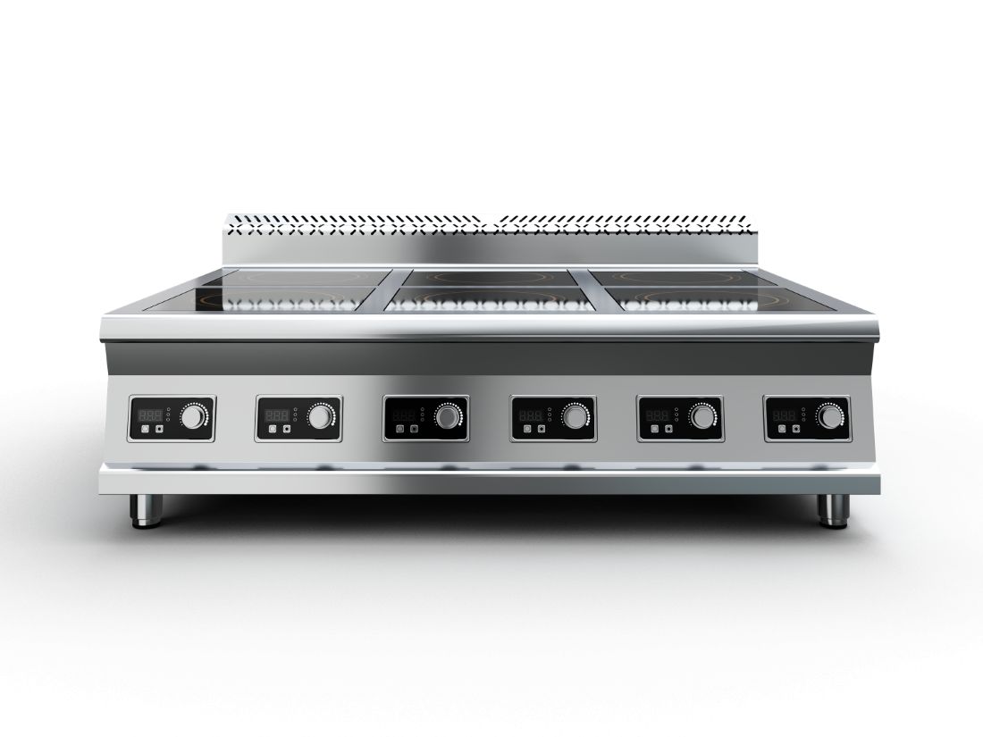 Плита индукционная, столешница из нержавеющей стали марки AISI 430 толщиной 1 мм, корпус из нержавеющей стали марки AISI 430 толщиной 0,8 мм. Имеет 6 конфорок мощностью по 3,5 кВт, питание 380 В. Габариты стеклокерамики 280х280х6 мм. Поставляется в собранном виде.