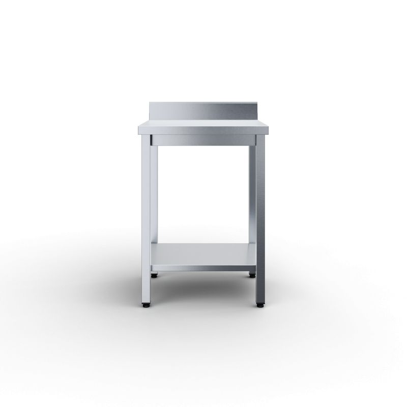 Стол изготовлен из нержавеющей стали марки AISI 430 толщиной 0,8 мм. Усиленная столешница с подложкой из фанеры толщиной 16 мм. Столешница и каркас выполнены из нержавеющей стали AISI 430. Стол оснащен сплошной полкой из стали марки AISI 430 толщиной 0,8 мм. Ножки регулируются по высоте. У производственного стола имеется съёмный борт, что позволяет использовать стол, как в пристенном, так и островном варианте. Борт устанавливается на месте при монтаже, по желанию клиента.
