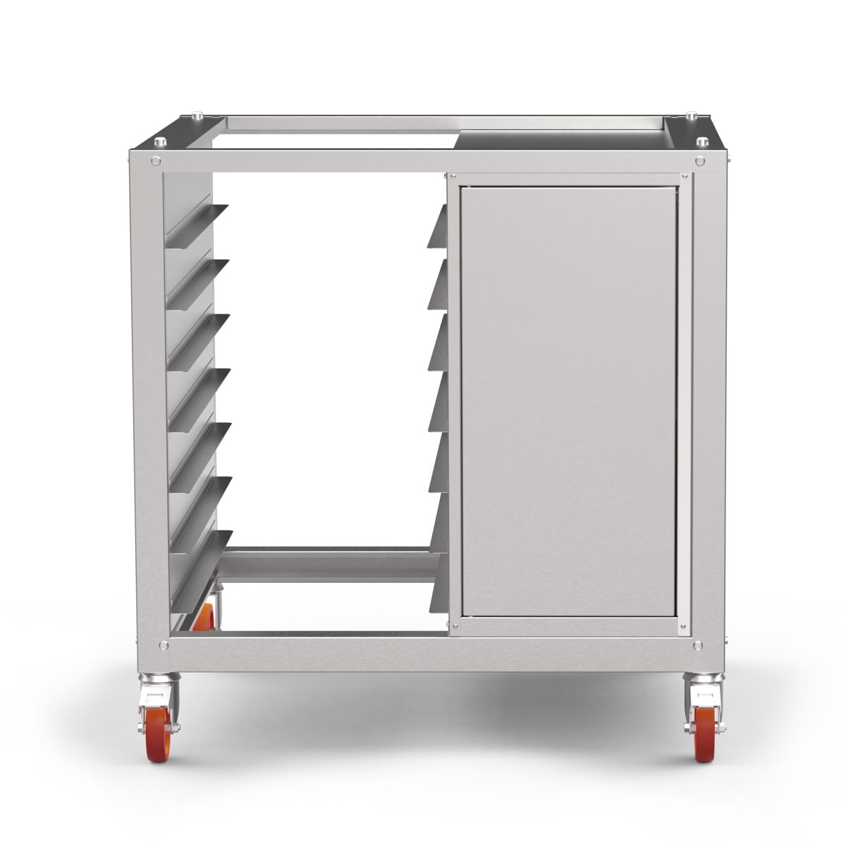 Подставка имеет два отсека, в левом отсеке установлены направляющие для хранения противней, в правом отсеке находится бак для моющей жидкости. Бак соединен шлангом с пароконвектоматом. В отсеке есть полка для хранения инвентаря и моющих средств.