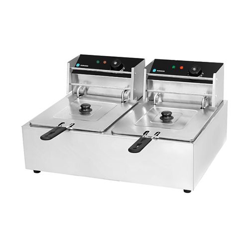 570x450x310мм, 6+6л, с крышкой, 2x2,5кВт, 220В, 8,6 кг, размер корзины (без ручки) 180x210x100мм, материал корпуса: нержавеющая сталь, температурный режим 60-200 С, емкости для масла легко снимаются, в комплектацию входят корзины и крышки, 2 вилки