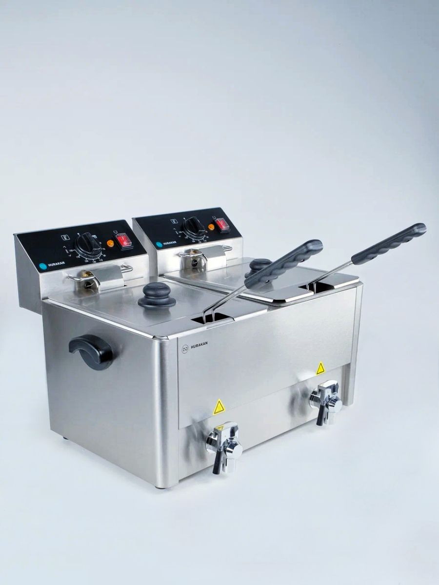 598x568x386, 220 В, 6,5 кВт, 14,6 кг, 2 ванны емкостью 8 л с крышками, 2 фритюрные корзины (размер корзины:240х140х190мм), материал корпуса: нержавеющая сталь, температурный режим 60-190 С, краны для слива масла