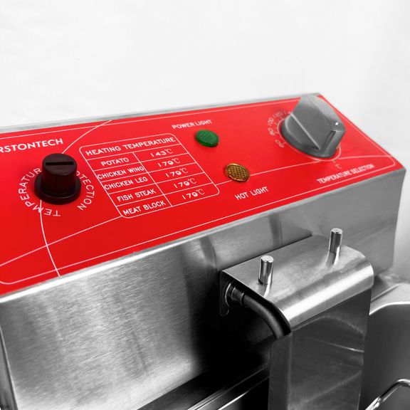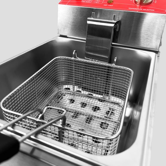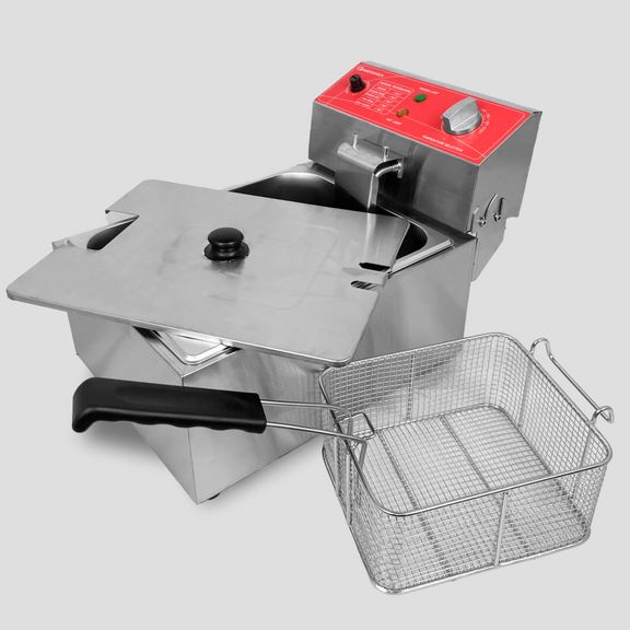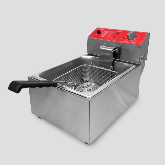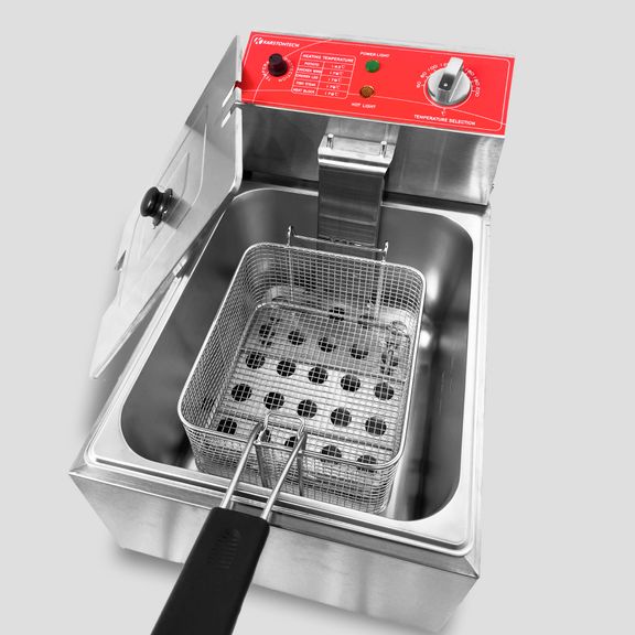 электрическая, настольная, рабочая температура 60-200С, защитный термостат, 1 съемный котел емкостью 6 л из нерж.стали с крышкой, 1 фритюрная корзина из нержавеющей стали размером 180х205х100 мм, материал корпуса - нерж.сталь.