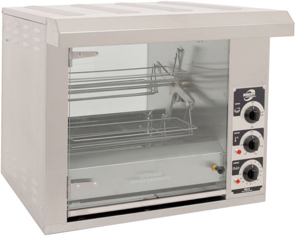 650х650х580мм,Гриль для кур электрический карусельный, 1 камера, загрузка 8 кур, нерж.сталь, электромех.управление, крыша с подсветкой. В комплекте вертел съемный, 4 люльки-корзины, поддон