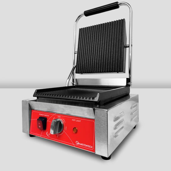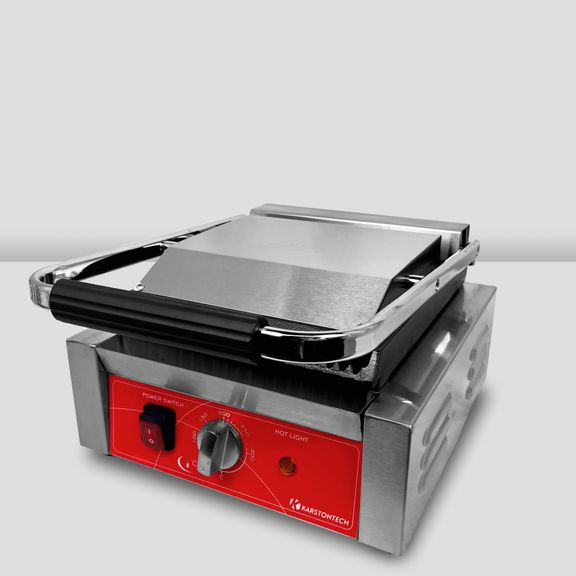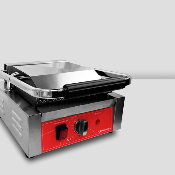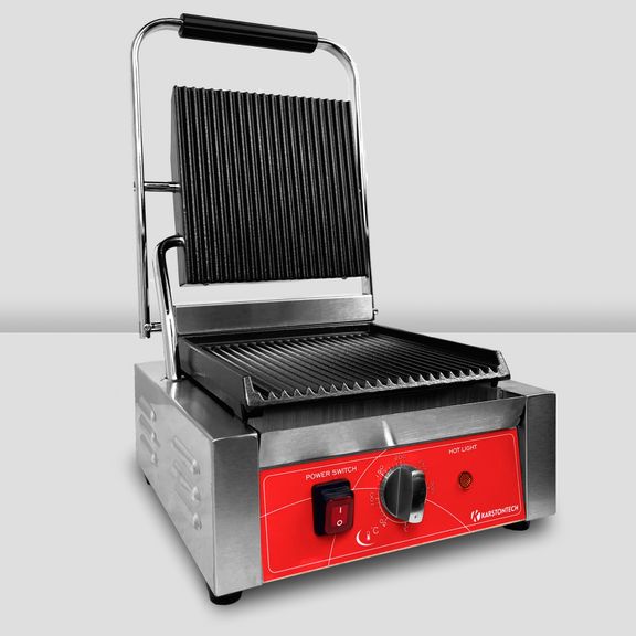 электрический, настольный, одинарный, малый, рифленые рабочие поверхности размером 215х215х20 мм из чугуна с антипригарным покрытием, рабочая температура 50-300С, защитный термостат, материал корпуса - нерж.сталь, в комплекте со щеткой для очистки