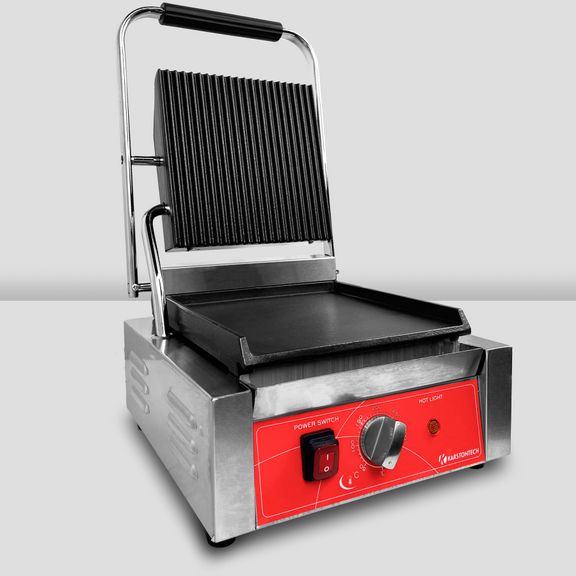 электрический, настольный, одинарный, малый, верх - рифленный, низ - гладкий, размером 215х215х20 мм из чугуна с антипригарным покрытием, рабочая температура 50-300С, защитный термостат, материал корпуса - нерж.сталь, в комплекте со щеткой для очистки