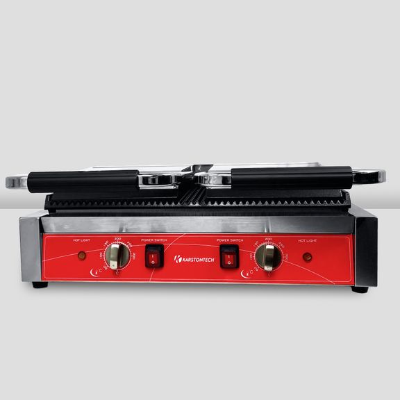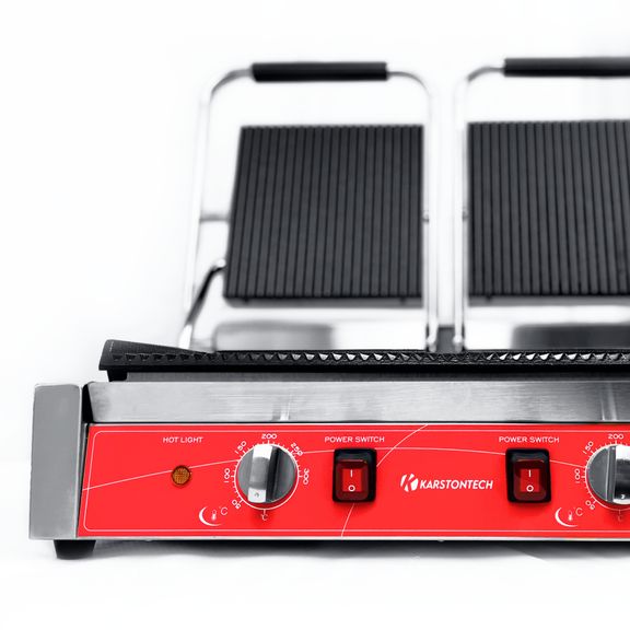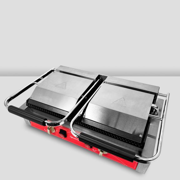 электрический, настольный, двойной, 1 рифленая нижняя/2 рифленые верхние рабочие поверхности размером 215х215х20 мм из чугуна с антипригарным покрытием, рабочая температура 50-300С, защитный термостат, материал корпуса - нерж.сталь, в комплекте со щеткой для очистки
