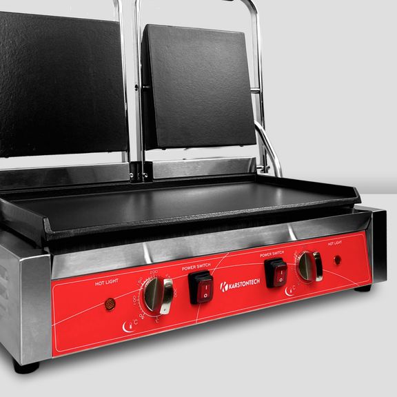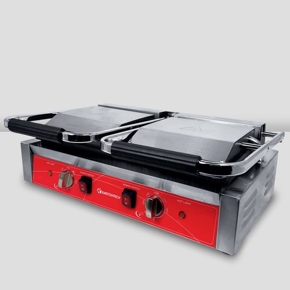 электрический, настольный, двойной, средний, 1 гладкая нижняя/2 гладкие верхние рабочие поверхности размером 215х215х20 мм из чугуна с антипригарным покрытием, рабочая температура 50-300С, защитный термостат, материал корпуса - нерж.сталь, в комплекте со щеткой для очистки