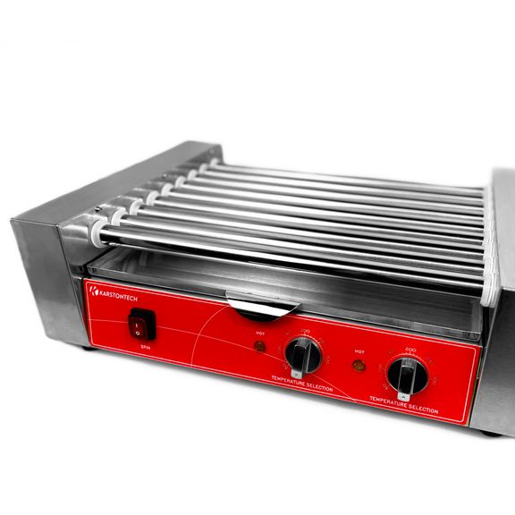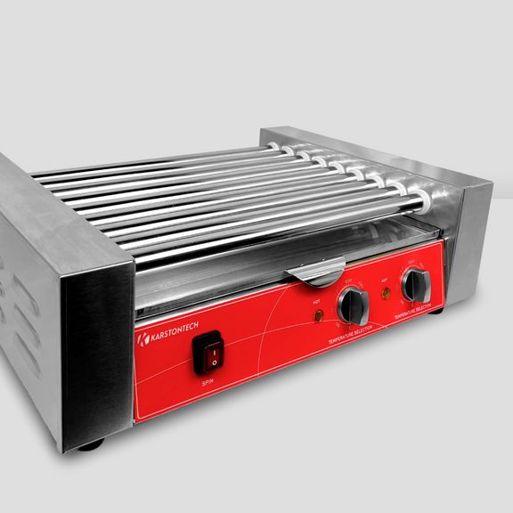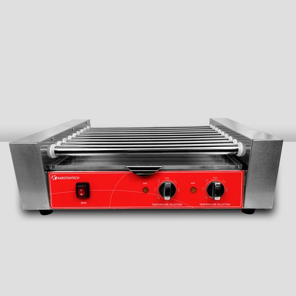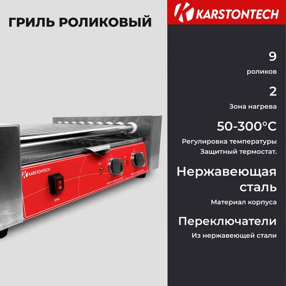 Настольный электрический роликовый гриль для хот-догов, сосисок KARSTONTECH KS-RG09 оснащен 9 роликами для равномерного обжаривания сосисок, сарделек, колбасок на предприятиях общественного питания и торговли. Роликовые грили KARSTONTECH позволяют автоматизировать процесс приготовления, упростить его и добиться стабильного качества приготавливаемого блюда.