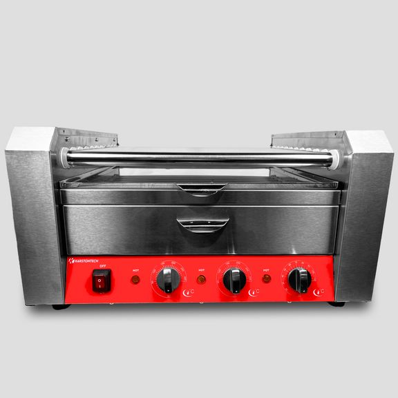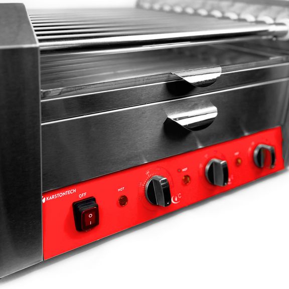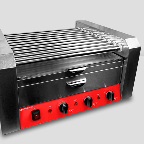 Настольный электрический роликовый гриль для хот-догов, сосисок KARSTONTECH KS-RG11W оснащен 11 роликами для равномерного обжаривания сосисок, сарделек, колбасок на предприятиях общественного питания и торговли. Роликовые грили KARSTONTECH позволяют автоматизировать процесс приготовления, упростить его и добиться стабильного качества приготавливаемого блюда. Отделение для подогрева булочек (мармит для булочек) специально предназначено для сохранения свежести выпечки и гарантирует превосходный результат.