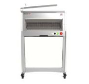 663*760*1243 мм, 0,49 кВт, 380В/3Ф, напольная полуавтоматическая модель, нож стальной 13*0,5мм, максимальный размер изделия для нарезки 440*320*160 мм, высота толкателя 80 мм, цвет - белый. Для нарезки ломтиками 13 мм. Производительность до 200 нарезок/час. Рычаг плавной тяги обеспечивает более качественное управление усилием. Съемный бак для сбора крошек емкостью 18 л. Устройство для расфасовки в пакеты облегчает упаковку хлеба.