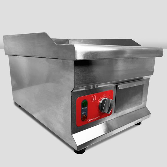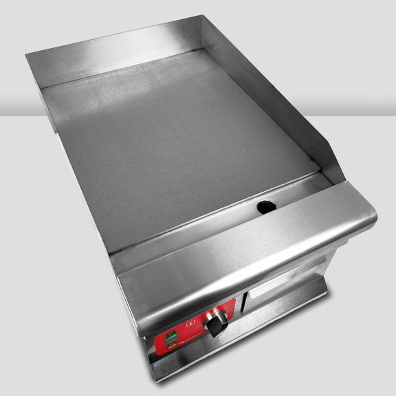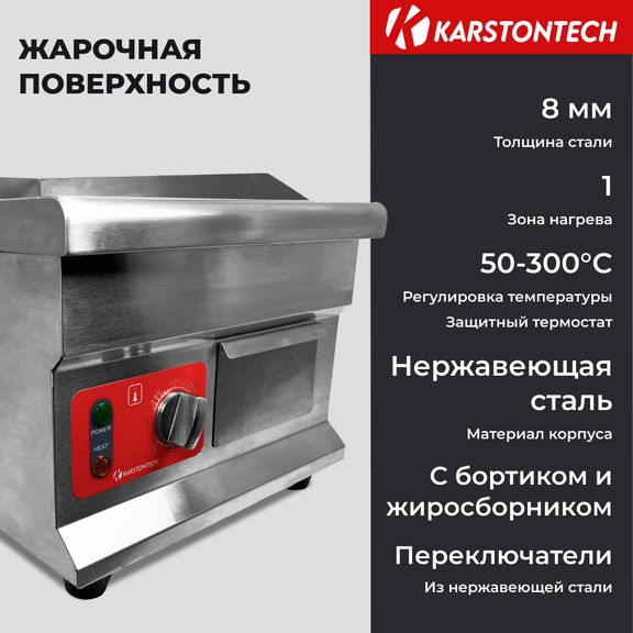 электрическая, настольная, гладкая рабочая поверхность из стали толщиной 8 мм с 1 зоной нагрева, 50-300С, защитный термостат, с бортиком и жиросборником, материал корпуса - нерж.сталь