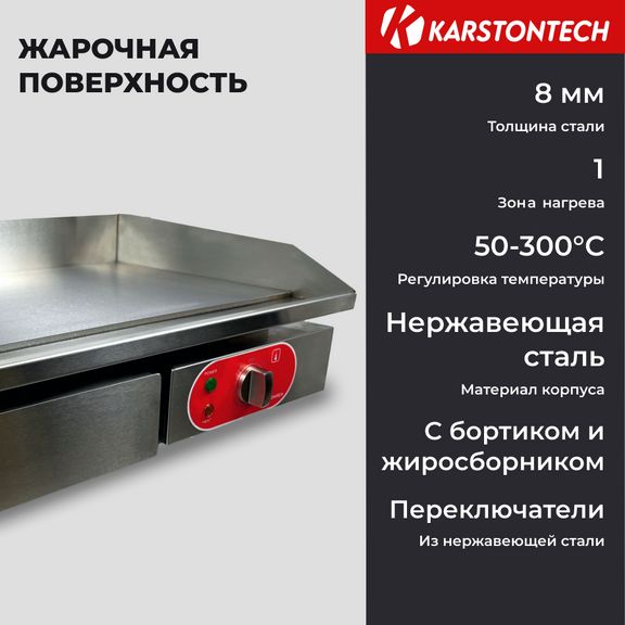 электрическая, настольная, гладкая рабочая поверхность из стали толщиной 8 мм с 1 зоной нагрева, 50-300С, защитный термостат, бортиком и жиросборником, материал корпуса - нерж.сталь