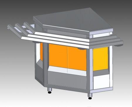 из линии раздачи питания "ШЕФ" из нержавеющей стали. Изделие относится к разряду профессионального кухонного оборудования и предназначено для встраивания в линию раздачи и установки линии прилавков самообслуживания с (наружным или внутренним) поворотом на 45° или 90°