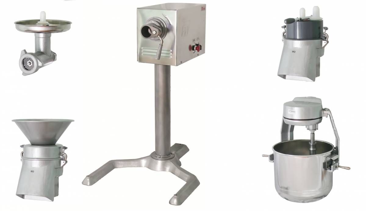 МО – механизм овощерезательно-протирочный. Нарезание сырых овощей и шинковка капусты; нарезание вареных овощей; протирание вареных овощей, фруктов и творога. Количество рабочих дисков – 6 шт. Нарезка овощей 200-350 кг/час., протирка картофельного пюре 600 кг/час.