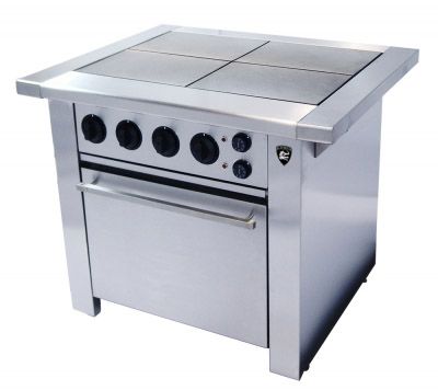 1047х872х860, 140 кг, 4 конфорки КЭ -0,12,4 (мощность конфорок 4х3кВт=12кВт), 4-х позиционных переключателя, съемные боковые полки плиты, увеличенная духовка GN 2/1 (мощность духовки 6кВт) , 4 направляющих под противни и гастроемкости, 2 термостата 50-300С, исполнение духовки - внутри сталь, снаружи нержавеющая сталь, дверь духовки глухая, усиленные шарниры двери духовки, комплектация духовки 2 противнями из стали, неразборная конструкция, 18 кВт 380 В, 380 В