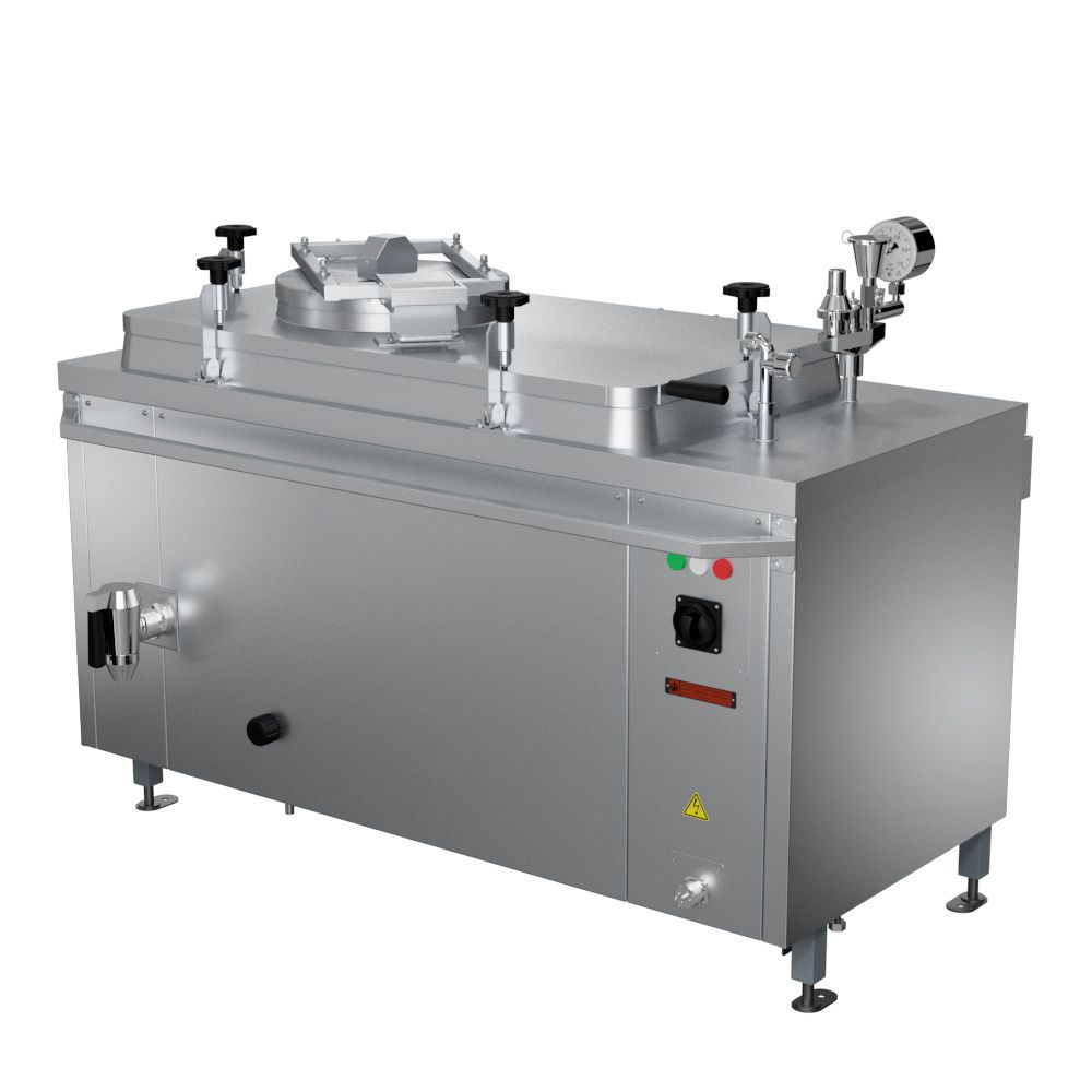 Конструктивной особенностью данных котлов является наличие двойной герметичной крышки. Одна крышка – прямоугольная, с накидными рычагами - служит для санитарной обработки, а также для загрузки продуктов в варочный сосуд. В верхней части прямоугольной крышки расположена горловина с дополнительной малой круглой крышкой, которая также является герметичной и на ней расположен перепускной клапан для сброса давления внутри емкости. Данная конструкция крышки котлов позволяет пользоваться изделием непосредственно через малую крышку, что особенно необходимо в период крена судна, качки, предотвращая тем самым выплескивание.