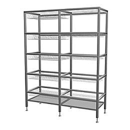 Стеллажи состоят из 5 полок, каждая из которых комплектуется 4-мя съемными кассетами для глубоких и мелких тарелок, бокалов и столовых приборов. Поддон для сбора воды (6 полка) съемный, изготовлен из нержавеющей стали.