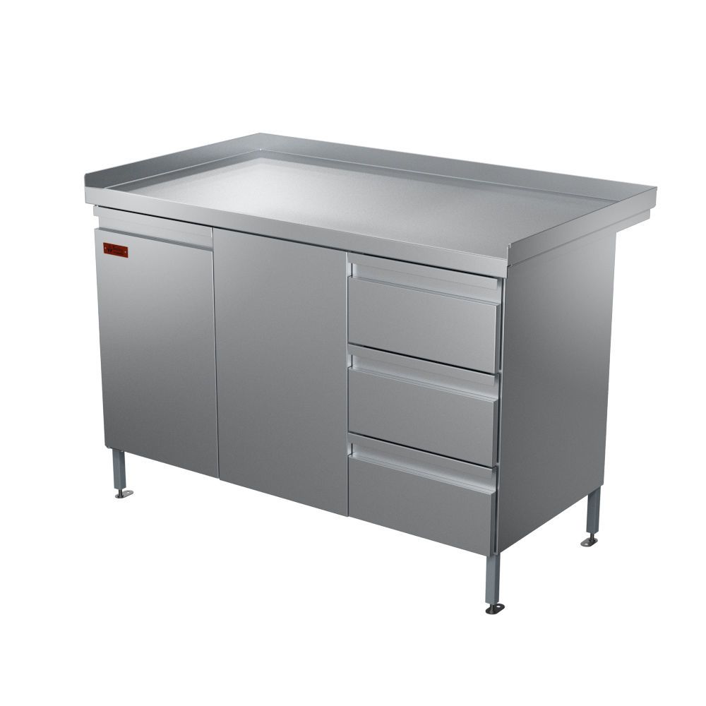 Столешница с обнижением по контуру, борт сзади. Каркас закрыт облицовками с трех сторон, слева дно и полка, закрытые спереди распашные двери, справа три выдвижных ящика. Штатные места крепления по штормовому для установки в помещении.