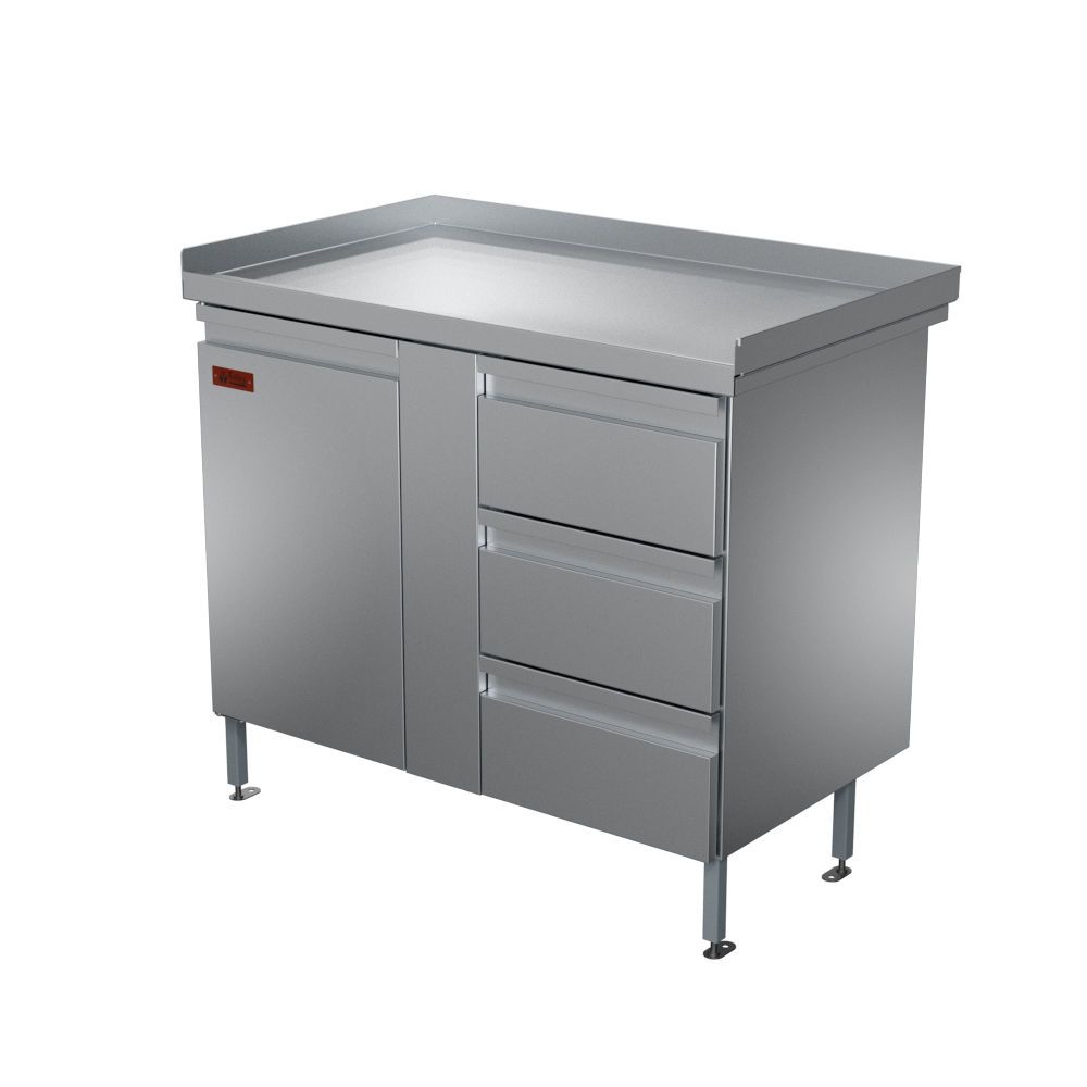 Столешница с обнижением по контуру и постоянный штормовой рейлинг 50 мм по контуру. Каркас закрыт облицовками с трех сторон, справа три выдвижных ящика, слева дно и полка, спереди распашная дверка. Дверки и ящики снабжены фиксаторами в закрытом положении. Штатные места крепления по штормовому для установки в помещении.
