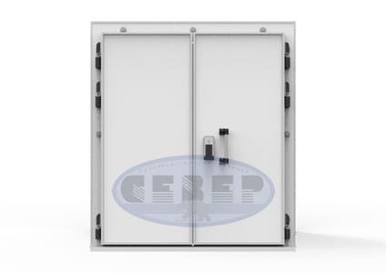 Размеры Север изготавливает двери толщиной 80 и 120 мм: Среднетемпературные и низкотемпературные; Пороговые или безпороговые; С левым или правым навесом петель. В среднетемпературном (СТ-80) исполнении двери предназначены для эксплуатации при температуре до -5°. В низкотемпературном исполнении (НТ) двери предназначены для эксплуатации при температурах от -5° до -20° (НТ-80), до -45° (НТ-120), комплектуются одноконтурным электрообогревом, вставленным в алюминиевый профиль на дверном проеме. Для обогрева беспороговых дверей используется опции: Облегченная порожная планка из алюминия с уложенным ПЭНом; Усиленная порожная планка из нержавеющей стали с уложенным ПЭНом. Обе створки могут иметь разную ширину полотна и выполняться по индивидуальному проекту заказчика. Стандартные створки производятся одинаковыми по ширине. Возможно изготовление дверей по техническому заданию клиента! Изоляция Жесткий пенополиуретан фирмы ДауИзолан, нагнетенный под высоким давлением, плотностью 40-45 кг/м3. Минимальное количество пор. Не содержит хлорфторуглеродов. Предел огнестойкости EI 15. Допускается использование для пищевых продуктов. Конструкция Рама дверного полотна изготовлена из анодированного алюминиевого профиля. Покрытие Стальной лист толщиной 0,45-0,65 мм, оцинкованный и окрашенный полиэфирной краской 25 мкм. Цвет белый «RAL 9003». Покрытие отслаивающейся защитной пленкой которая обеспечивает защиту двери от повреждений при транспортировке и монтаже. Допускается использование для пищевых продуктов. По желанию заказчика покрытие может быть выполнено из: Неокрашенной оцинкованной стали; Нержавеющей стали AISI 304/430 (для пищевой/непищевой промышленности), шлифованная или шлифованная декоративная с рисунком «Мороз»; Из окрашенной оцинкованной стали по таблице цветов RAL; Рифленого алюминиевого листа (квинтета). Герметичность Съемное двухконтурное резиновое уплотнение по периметру (сотовая структура) на опоре из ПВХ во избежание мостов холода. Двери для низкотемпературных камер (НТ) оборудованы двухконтурным электрообогревом периметра примыкания двери к раме. Фурнитура Холодильные двери ТМ «Север» комплектуются фурнитурой европейской фирмы. В соответствии с европейскими требованиями безопасности, замки снабжены устройством для открывания, позволяющим открывать дверь изнутри при случайном запирании персонала внутри камеры. Внутренняя часть замка имеет флуоресцентную наклейку. В комплект двери входит комплект крепления дверной рамы к сэндвич-панели или к бетонной стене (уточняется заказчиком). Дверной проем Накладной или монолитный дверной проем из ППУ панелей, с соединением «шип-паз» или замок. Встраиваемый проем в холодильную камеру с соединением «шип-паз» / замок Проём на раме ПВХ Проём на металлической раме Проём с вырезом под кран-балку. Комбинированная облицовка проема пластиковым профилем с Al (дополнительная опция) Доп. опции Возможность комплектации двери одинарным стеклопакетом 400х400 или 300х1000 мм Отбойник на двери.