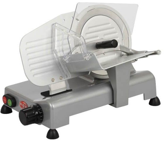Габариты 430 х 300 х 292 мм. Версия DOM. Диаметр ножа 195 мм, рез 165 х 130 мм. Полуавтоматический слайсер для нарезки мяса, сыра, колбасных изделий и других продуктов питания. Толщина нарезки 0-14?16 мм. Слайсер для профессионального использования на предприятиях общественного питания. Нож из хромированной стали, корпус из лакированного алюминия с пластиковыми деталями. Съемное заточное устройство.