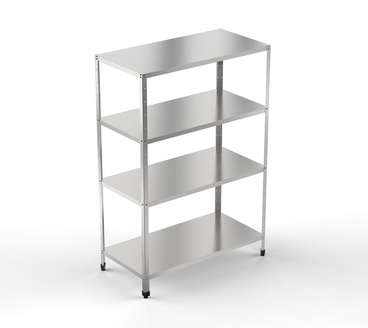 1500х500х1800мм, Стеллаж кухонный, 4 сплошные полки выполненные из нерж. стали марки AISI 430, толщина 0,8 мм; каркас разборный - уголок из стали AISI 430, 1,5мм- толщиной.