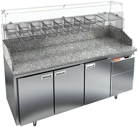 1835х700х1050мм, PZ3-111/GN КАМЕНЬ стол для пиццы охл.(+2+10), 3 двери, с бортом с 3х сторон, 1835х700х1050мм