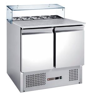 900x700x1075 мм, 230В, 0,17 кВт, 240 л, +2...+8 C, каменная столешница без бортов, 2 двери, полки GN1/1, одна полка для каждой двери в комплекте, отделение под 5*GN1/6 со стеклянным козырьком (гастроемкости в комплект не входят), нижнее расположение холодильного агрегата, вентилируемое охлаждение