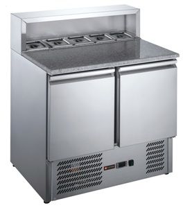 900x700x1075 мм, 230В, 0,17 кВт, 240 л, +2...+8 C, каменная столешница без бортов, 2 двери, полки GN1/1, одна полка для каждой двери в комплекте, отделение под 5*GN1/6 с металлическим козырьком (гастроемкости в комплект не входят), нижнее расположение холодильного агрегата, вентилируемое охлаждение