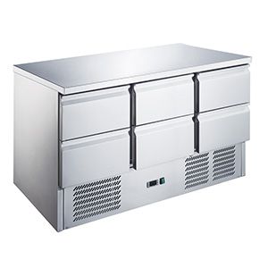 1365x700x876мм, 155 кг, 0,24кВт, 230В, 368л температурный режим +2/+8, статическое охлаждение с вспомогательным вентилятором, столешница из нержавеющей стали, 6 ящиков, нижнее расположение холодильного агрегата