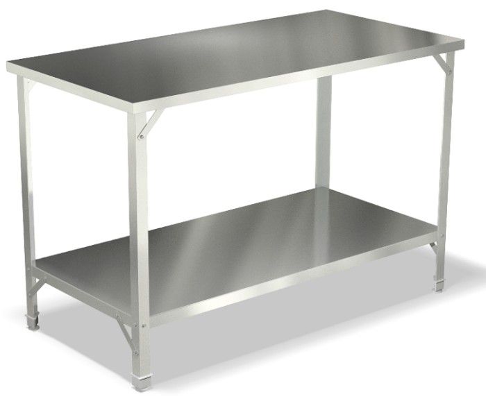 1500х700х850мм, Стол производственный без борта, столешница из нержавеющей стали AISI 430 толщиной 0,5 мм с подложкой ДСП толщиной 16 мм. Каркас из оцинкованной стали толщиной 1,5 мм, сплошная полка из оцинкованной стали толщиной 0,55 мм с усилителем. Полка стола выдерживает распределенную статическую нагрузку - 40 кг, столешница - 100 кг. Наличие подгибов по периметру столешницы и полки исключает опасность травм.